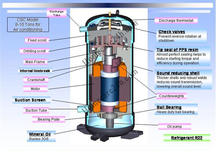 Thông thường một chiếc lốc điều hòa dạng cuộn sẽ gồm các bộ phận như: động cơ điện, piston, xilanh, bộ phận nén xoắn ốc, vỏ máy nén và một số chi tiết nhỏ khác.
