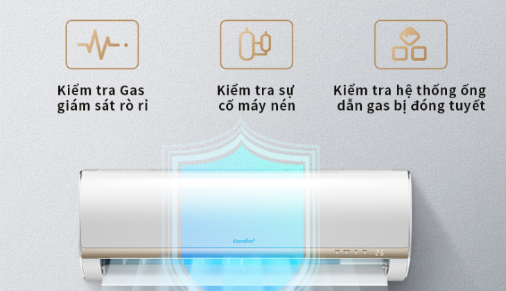 Máy lạnh Comfee luôn giám sát rò rỉ của hệ thống máy lạnh thông qua áp dụng nhiệt độ T2, thời gian thực hiện kiểm ra giám sát tình trạng vận hành máy nén. Nếu hệ thống gặp vấn đề sẽ lập tức phản hồi sự cố EL, nhắc nhở kiểm tra sửa chữa, đảm bảo an toàn về sản phẩm.