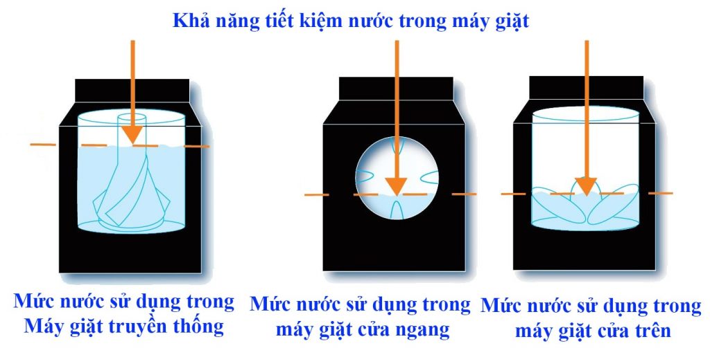 Lồng giặt ngang: với kiểu thiết kế này thì quần áo sẽ được chuyển động theo chiều thẳng đứng. Vì vậy không cần mực nước quá đầy nước mà quần áo vẫn được thấm đều và giặt sạch, tiết kiệm nước gấp 3 lần so với máy giặt lồng đứng.
