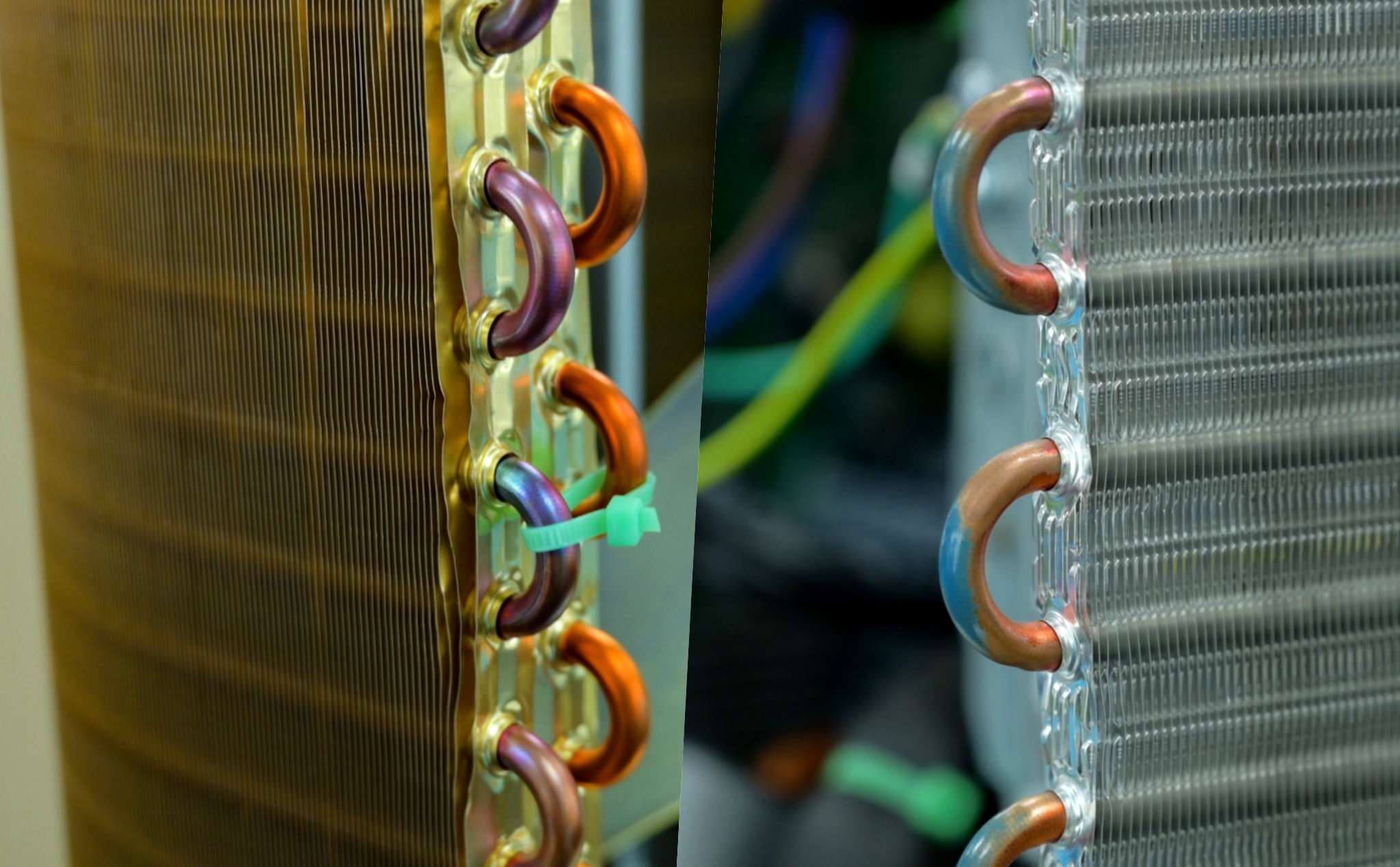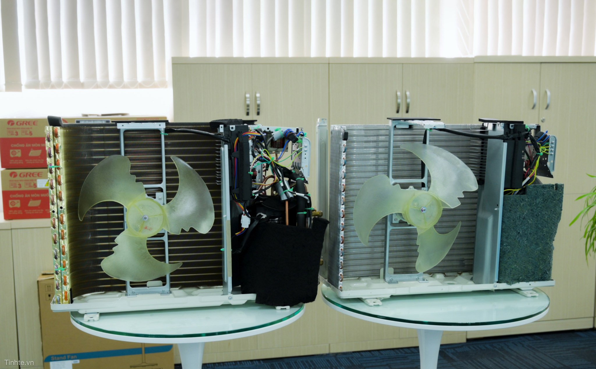 Dàn máy được làm bằng ống đồng gắn nhiều dàn đồng đôi (dàn thường là đồng đơn) giúp tản nhiệt tốt hơn, máy cũng có độ bền cao hơn dàn nóng bình thường. Như hình trên: Bên trái là lớp vách của Gree còn bên phải là máy bình thường, bên cạnh Golden Fin thì phần vách cũng double, đồng thời ống cũng sử dụng tiết diện lớn hơn để môi chất lạnh đi nhiều và nhanh hơn, giúp làm lạnh hiệu quả.